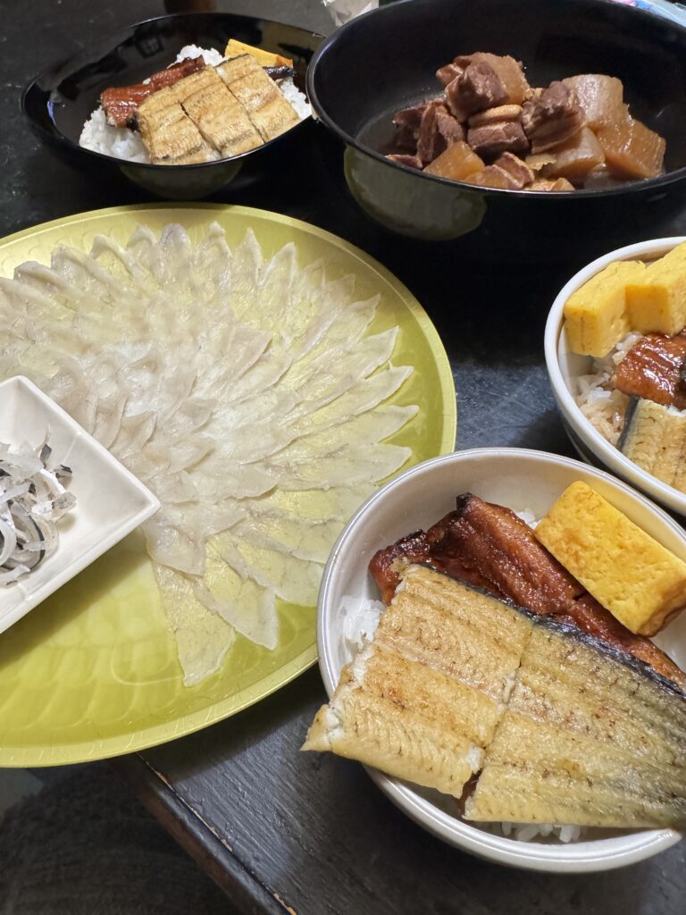 1/1は豊川のなか卯でなんと総務の戸塚さんと遭遇し、夜は会社のお歳暮大会で当たったウナギとイオンのとらふぐ💕
