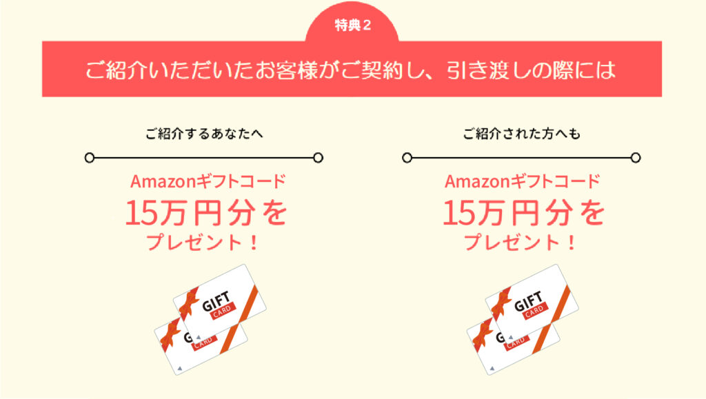 ご紹介されたご友人のご来店、およびご契約後引渡しの際にプレゼントを進呈いたします。