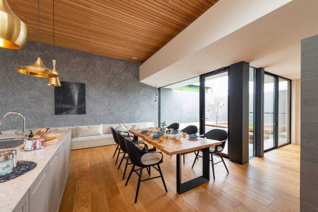 高めの天井にはたっぷりの木を使い上質な空間を演出しています。