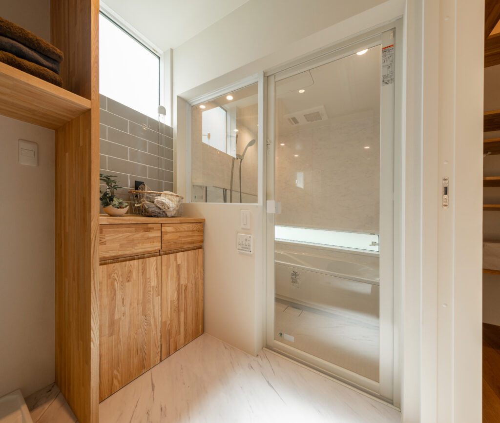 ランドリースペースにも木材がたっぷり配置され、暮らしに癒しを与えてくれます。