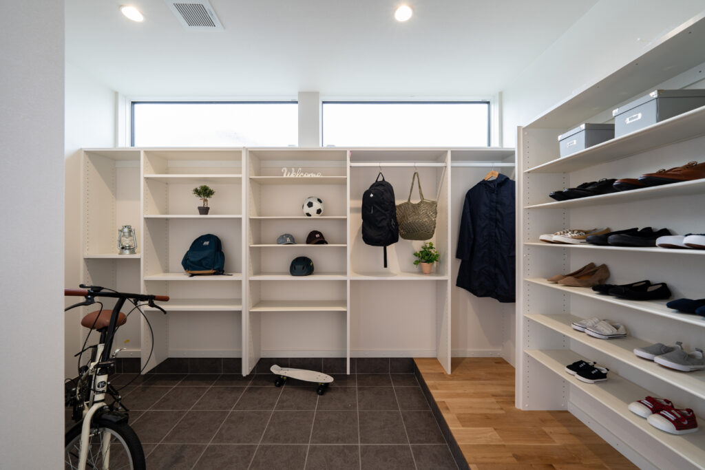 こちらはオープン型のシューズクローク兼収納をたっぷりそなえた玄関土間。自転車を置くスペースも十分。棚は全て可動式のため、ベビーカーを差し込んだり、トランクやアウトドア用品もたっぷり収納できます。