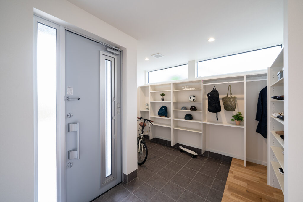 シューズクローク&アウトドア用品もたっぷり飾って収納!お出かけが楽しくなる玄関土間