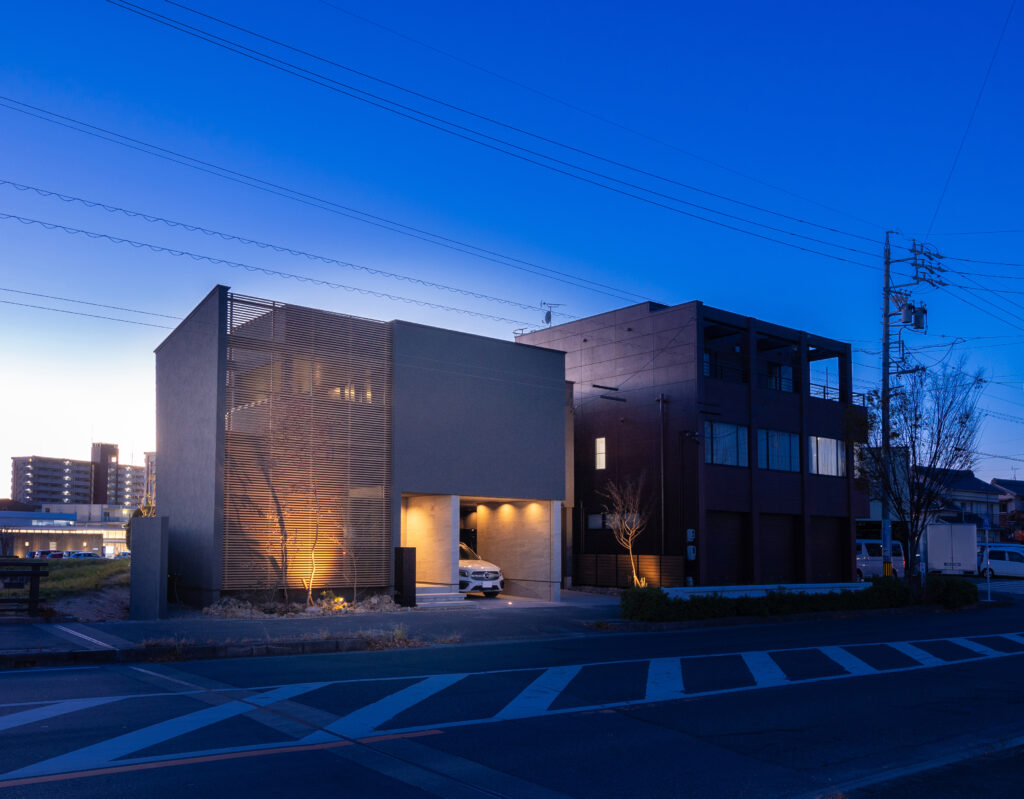 車2台分のビルトインガレージを備え、雨の日でも濡れずに室内へ。夜は間接照明が外壁を柔らかく照らし、昼間とは違うラグジュアリーな表情を見せます。