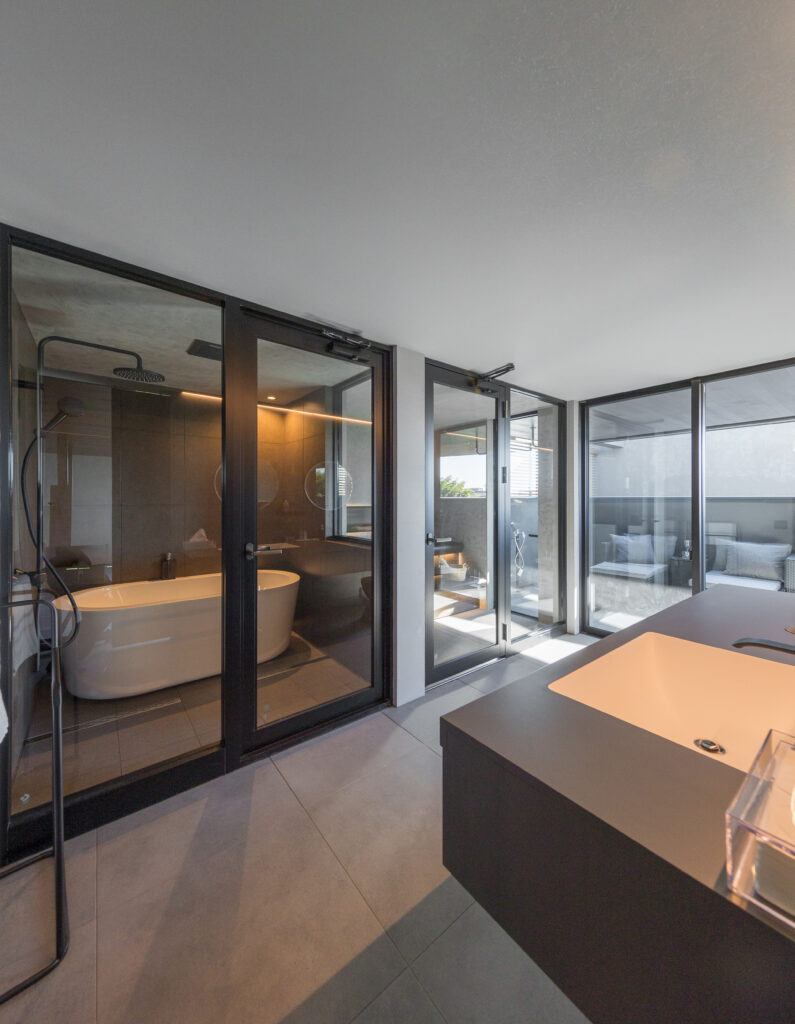 すぐ横にはガラス張りのバスルームと、バルコニーへつながるドア。サウナ後はそのまま外気浴スペースに出て、星空を眺めながらクールダウンできる動線設計になっています。