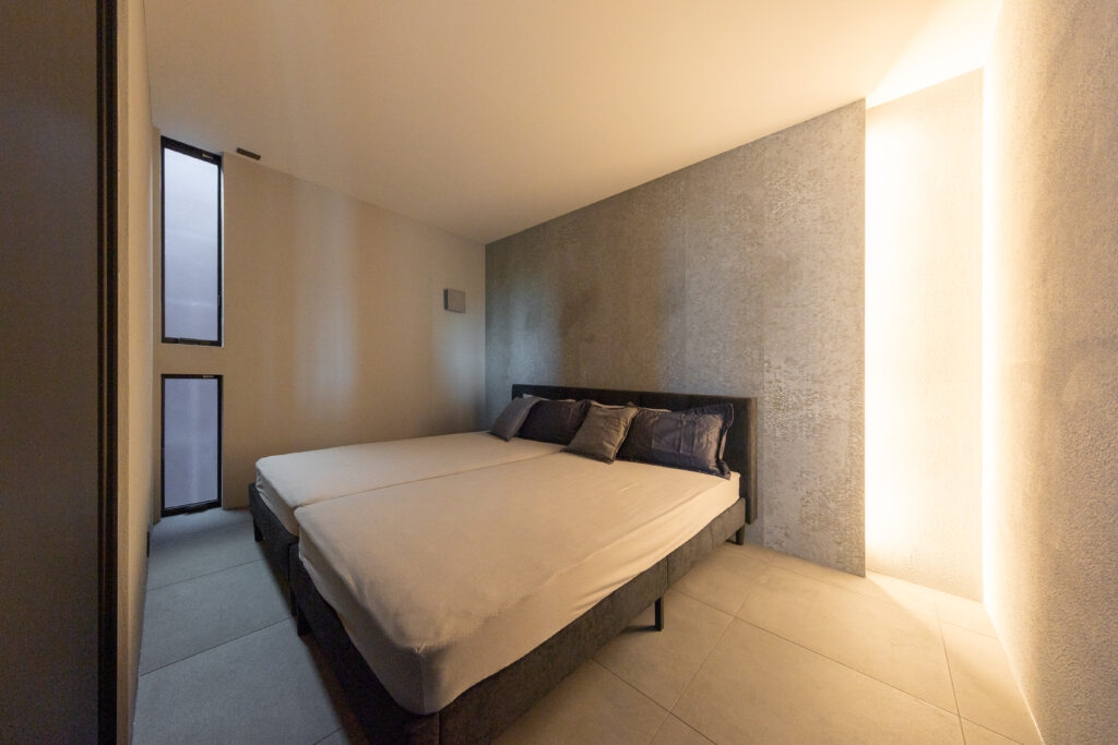 主寝室は間接照明が天井をやわらかく照らし、落ち着いた夜の時間を演出します。