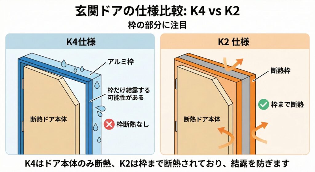 ここで注意点として、K4とK2ではあまり差がないように見えますが、注目すべきは枠の部分です。先ほどお伝えしたように、K4はドア本体は断熱されていますが、枠はアルミのままなので、枠だけ結露する可能性があるんです。