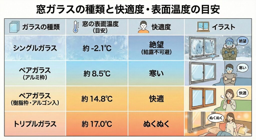 外気温0℃の場合、シングルガラスの表面温度は約5℃でほぼ冷蔵庫状態。