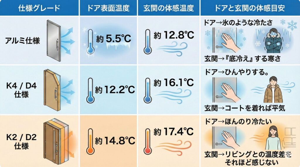 玄関ドアの断熱性能ランクの違いによる「温度の違い」
