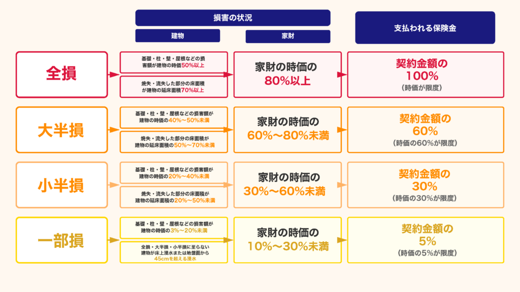 といった「一部損壊レベルの被害」も含めて補償される点が、大きな違いです。