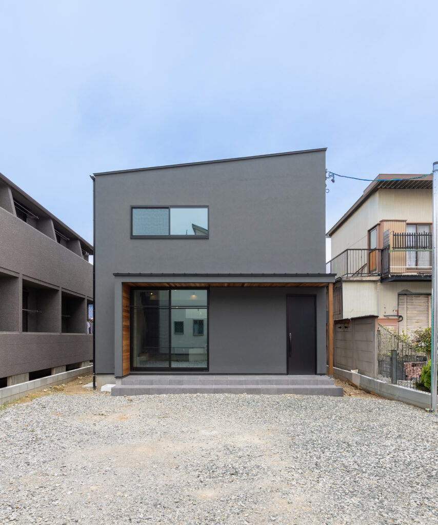 黒の外壁とシンプルなシルエットが存在感を放つ外観。窓の配置や玄関まわりの木目が、スタイリッシュさと温かみを絶妙に両立しています。
