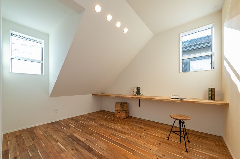 趣味や宿題、読書などプライベートな時間を過ごすことができるワークスペース。前面の壁にはマグネット下地を使用することで大事な書類をつけたり、ポストカードを飾ったり使い方・楽しみ方は色々。室内に入ると開放感あふれる吹抜けに大きなスクエア型の窓がお出迎え。お子様たちが伸び伸びと過ごせる家をコンセプトに理想を叶えたお家が完成しました。